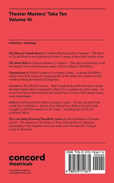 The Moon is Upside Down by Comfort Ifeoma Katchy (2 women) - The Moon is Upside Down is an exploration of what it means to have faith amidst crisis. The Quiet Rule by Connor Johnson (1 woman) - This play is an apology to all the people I have secretly gotten upset with for talking at the library. Usurpations by Natalie Lambert (3 women, 3 men) - A group of children collect what little scraps of writing are left in the fallout of a world in which words are being destroyed and forgotten. Carrots by Ally Merkel (2 men) - Best friends Jack and Everett shoot hoops the night before Jack is supposed to depart for a summer at piano camp - an event that Jack is determined to get himself out of, even if that means losing some appendages. 2052 by Gretchen Suárez-Peña (2 women, 1 man) - It's not the end of the world, but it feels like it. Almost three billion have died so far and Isolde struggles to find the reasons for the losses - including that of his late girlfriend, Maite. The Courtship Ritual of Sandhill Cranes by Emma Watkins (2 femme actors) - Two docents at the Heart of Texas Natural History Museum contemplate what happens when you study your life instead of living it. A play in dioramas.