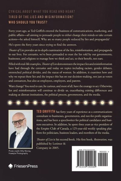 Cynical about what you read and hear? Tired of the lies and misinformation? Who should you trust? Forty years ago, as Ted Griffith entered the business of communications, marketing, and public affairs-all aiming to persuade people to either change their minds or take certain actions-he asked himself, Why are so many people seduced by lies and propaganda? He's spent the forty years since trying to find the answers. Theater of Lies provides an in-depth examination of the lies, misinformation, and propaganda in our lives. For centuries, we've been persuaded to trust the lies told by our governments, businesses, and religions to manage how we think and act, to their benefit, not ours. Filled with real-life examples, Theater of Lies demonstrates the impact lies and misinformation have had through the centuries and today on topics including racism, gender debates, entrenched political divides, and the status of women. In addition, it examines how and why we repeat these lies and the impact this has on our decision-making, not just as voters and consumers, but also as employees, employers, and parents. Want change? You need to care, be curious, and most of all, have the courage to act. Otherwise, lies and misinformation will continue to divide us, exacerbating existing differences and making us distrust institutions, the political process, governments, and the media.