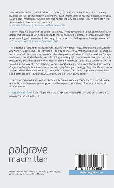 "George Home-Cook's Theatre and Aural Attention: Stretching Ourselves ... is a must-read for students and academics of all things dramaturgical. It calls for an attention to the invisible and offers an earnest contribution to the quest for a listening beyond dialogue in the atmosphere of the performed." (Salomé Voegelin, timeshighereducation.com, December, 2015)