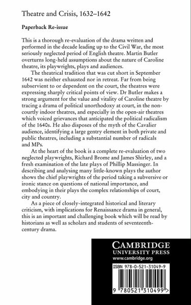 This is a thorough re-evaluation of the drama written and performed in the decade leading up to the Civil War, the most seriously neglected period of English theatre. Martin Butler overturns long-held assumptions about the nature of Caroline theatre, its playwrights, plays and audiences. The theatrical tradition that was cut short in September 1642 was neither exhausted nor in retreat. Far from being subservient to or dependent on the court, the theatres were expressing sharply critical points of view. Dr Butler makes a strong argument for the value and vitality of Caroline theatre by tracing a drama of political unorthodoxy at court, in the non-courtly indoor theatres, and especially in the open-air theatres which voiced grievances that anticipated the political radicalism of the 1640s. At the heart of the book is a complete re-evaluation of two neglected playwrights, Richard Brome and James Shirley, and a fresh examination of the late plays of Philip Massinger. As a piece of closely integrated historical and literary criticism, with implications for Renaissance drama in general, this is an important and challenging book which will be read by historians as well as scholars and students of seventeenth-century drama.