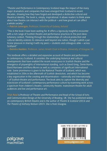 This textbook offers a detailed and expansive account of theatre and performance in contemporary Scotland. It considers the underlying historical and cultural developments that have enabled the recent renaissance in Scottish theatre and the emergence of playwrights of international standing, such as David Greig, Zinnie Harris, David Harrower and Rona Munro as well as companies of significant international note. Some prominence is given to the National Theatre of Scotland, which was established in 2004 in the aftermath of Scottish devolution, and which has become a key organization in the creating and dissemination - nationally and internationally - of Scottish theatre and performance. The book aims to capture the diversity and eclecticism of Scotland's contemporary performance culture by examining work across a spectrum from children's theatre, community theatre, mainstream theatre for adult audiences and live and performance art.