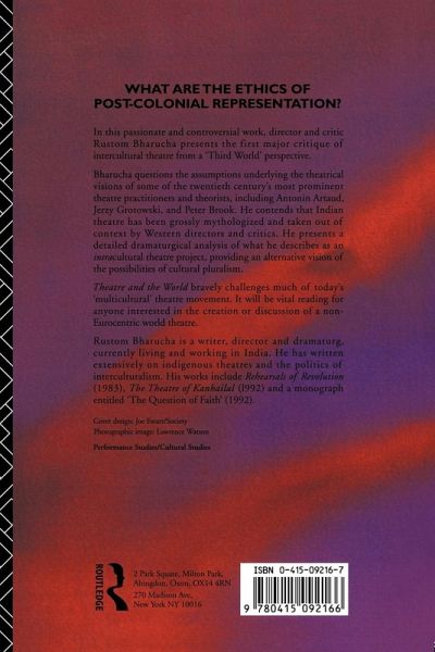 In this passionate and controversial work, director and critic Rustom Bharucha presents the first major critique of intercultural theatre from a 'Third World' perspective. Bharucha questions the assumptions underlying the theatrical visions of some of the twentieth century's most prominent theatre practitioners and theorists, including Antonin Artaud, Jerzsy Grotowski, and Peter Brook. He contends that Indian theatre has been grossly mythologised and taken out of context by Western directors and critics. And he presents a detailed dramaturgical analysis of what he describes as an intracultural theatre project, providing an alternative vision of the possibilities of true cultural pluralism. Theatre and the World bravely challenges much of today's 'multicultural' theatre movement. It will be vital reading for anyone interested in the creation or discussion of a truly non-Eurocentric world theatre.