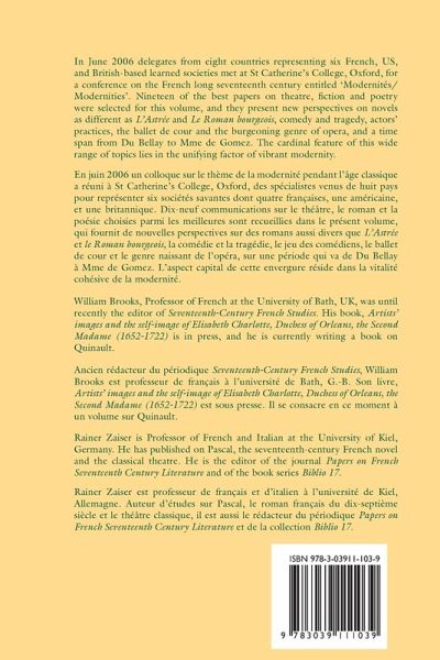 The Editors: William Brooks, Professor of French at the University of Bath, UK, was until recently the editor of Seventeenth-Century French Studies. His book, Artists¿ images and the self-image of Elisabeth Charlotte, Duchess of Orleans, the Second Madame (1652-1722) is in press, and he is currently writing a book on Quinault. Rainer Zaiser is Professor of French and Italian at the University of Kiel, Germany. He has published on Pascal, the seventeenth-century French novel and the classical theatre. He is the editor of the journal Papers on French Seventeenth Century Literature and of the book series Biblio 17. Les responsables de la publication : Ancien rédacteur du périodique Seventeenth-Century French Studies, William Brooks est professeur de français à l¿université de Bath, G.-B. Son livre, Artists¿ images and the self-image of Elisabeth Charlotte, Duchess of Orleans, the Second Madame (1652-1722) est sous presse. Il se consacre en ce moment à un volume sur Quinault. Rainer Zaiser est professeur de français et d¿italien à l¿université de Kiel, Allemagne. Auteur d¿études sur Pascal, le roman français du dix-septième siècle et le théâtre classique, il est aussi le rédacteur du périodique Papers on French Seventeenth Century Literature et de la collection Biblio 17.