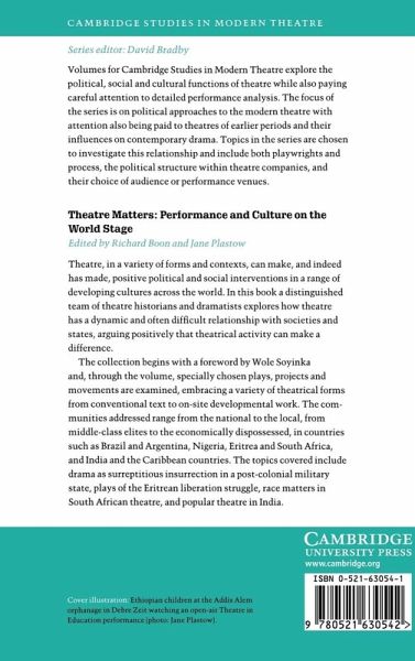 Theatre, in a variety of forms and contexts, can make, and indeed has made, positive political and social interventions in a range of developing cultures across the world. In this book a distinguished team of theatre historians and dramatists explores how theatre has a dynamic and often difficult relationship with societies and states, arguing positively that theatrical activity can make a difference. The collection begins with a foreword by Wole Soyinka and, through the volume, specially chosen plays, projects and movements are examined, embracing a variety of theatrical forms from conventional text to on-site developmental work. The communities addressed range from the national to the local, from middle-class elites to the economically dispossessed in countries such as Brazil and Argentina, Nigeria, Eritrea and South Africa, and India and the Caribbean countries.