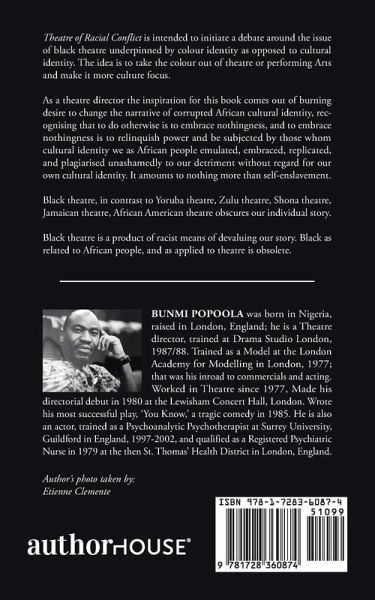 Theatre of Racial Conflict is intended to initiate a debate around the issue of black theatre underpinned by colour identity as opposed to cultural identity. The idea is to take the colour out of theatre or performing Arts and make it more culture focus. As a theatre director the inspiration for this book comes out of burning desire to change the narrative of corrupted African cultural identity, recognising that to do otherwise is to embrace nothingness, and to embrace nothingness is to relinquish power and be subjected by those whom cultural identity we as African people emulated, embraced, replicated, and plagiarised unashamedly to our detriment without regard for our own cultural identity. It amounts to nothing more than self-enslavement. Black theatre, in contrast to Yoruba theatre, Zulu theatre, Shona theatre, Jamaican theatre, African American theatre obscures our individual story. Black theatre is a product of racist means of devaluing our story. Black as related to African people, and as applied to theatre is obsolete.