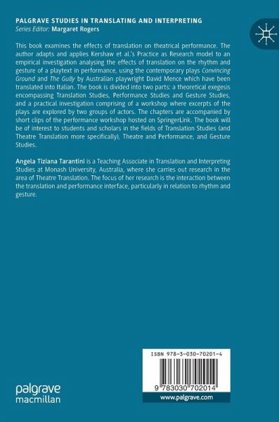 This book examines the effects of translation on theatrical performance. The author adapts and applies Kershaw et al.'s Practice as Research model to an empirical investigation analysing the effects of translation on the rhythm and gesture of a playtext in performance, using the contemporary plays Convincing Ground and The Gully by Australian playwright David Mence which have been translated into Italian. The book is divided into two parts: a theoretical exegesis encompassing Translation Studies, Performance Studies and Gesture Studies, and a practical investigation comprising of a workshop where excerpts of the plays are explored by two groups of actors. The chapters are accompanied by short clips of the performance workshop hosted on SpringerLink. The book will be of interest to students and scholars in the fields of Translation Studies (and Theatre Translation more specifically), Theatre and Performance, and Gesture Studies.