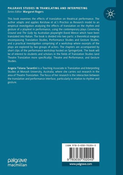 This book examines the effects of translation on theatrical performance. The author adapts and applies Kershaw et al.'s Practice as Research model to an empirical investigation analysing the effects of translation on the rhythm and gesture of a playtext in performance, using the contemporary plays Convincing Ground and The Gully by Australian playwright David Mence which have been translated into Italian. The book is divided into two parts: a theoretical exegesis encompassing Translation Studies, Performance Studies and Gesture Studies, and a practical investigation comprising of a workshop where excerpts of the plays are explored by two groups of actors. The chapters are accompanied by short clips of the performance workshop hosted on SpringerLink. The book will be of interest to students and scholars in the fields of Translation Studies (and Theatre Translation more specifically), Theatre and Performance, and Gesture Studies.