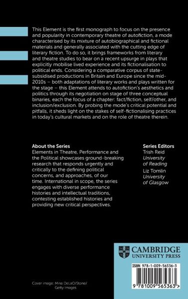 This Element is the first monograph to focus on the presence and popularity of autofiction in contemporary theatre, a mode characterised by its mixture of autobiographical and fictional materials and generally associated with the cutting edge of literary fiction. To do so, it brings frameworks from literary and theatre studies to bear on a recent upsurge in plays that explicitly mobilise lived experience and its fictionalisation to political ends. Considering a comparative corpus of state-subsidised productions in Britain and Europe since the mid 2010s - both adaptations of literary works and plays written for the stage - this Element attends to autofiction's aesthetics and politics through its negotiation on stage of three conceptual binaries, each the focus of a section: fact/fiction, self/other, and inclusion/exclusion. By probing the mode's critical potential and pitfalls, it sheds light on the stakes of self-fictionalising practices in today's cultural markets and on the role of theatre therein.