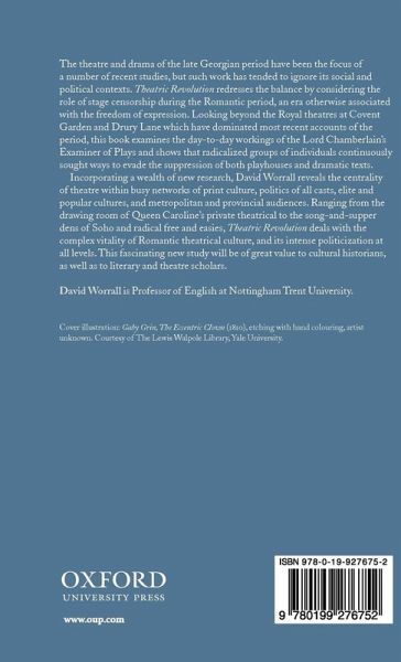 Incorporating a wealth of new research, David Worrall reveals the centrality of theatre within busy networks of print culture, politics of all casts, elite and popular cultures, and metropolitan and provincial audiences. Ranging from the drawing room of Queen Caroline's private theatrical to the song-and-supper dens of Soho and radical free and easies, Theatric Revolution deals with the complex vitality of Romantic theatrical culture, and its intense politicization at all levels. This