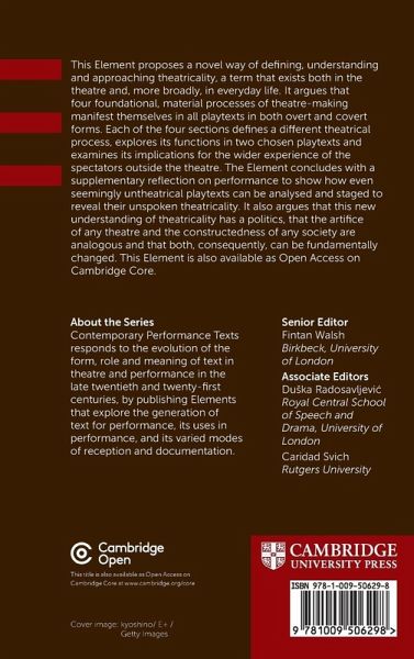 This Element proposes a novel way of defining, understanding, and approaching theatricality. It argues that four foundational, material processes of theatre-making manifest themselves in all playtexts in both overt and covert forms. This title is also available as Open Access on Cambridge Core.
