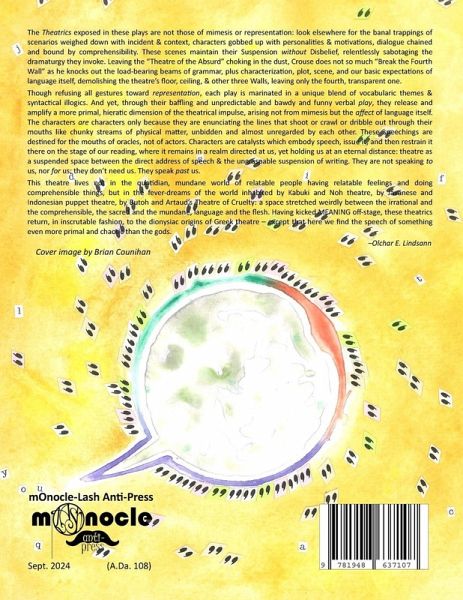 The Theatrics exposed in these plays are not those of mimesis or representation - look elsewhere for the banal trappings of scenarios weighed down with incident and context, for characters gobbed up with personalities or motivations, for dialogue chained and bound by comprehensibility. These scenes maintain their Suspension without Disbelief. From start to finish, they relentlessly sabotage the very dramaturgy they invoke. Leaving the "Theatre of the Absurd" choking in the dust, John Crouse does not so much "Break the Fourth Wall" as he knocks out the load-bearing beams of grammar, plus characterization, plot, scene, and our basic expectations of language itself, in order to demolish the theatre's floor, ceiling, and the other three Walls, leaving only the fourth one that's transparent. Though refusing all gestures toward representation, each play is marinated in a unique blend of vocabularic themes and syntactical illogics. And yet, through their baffling and unpredictable and raunchy and often funny verbal play, they release and amplify a more primal, hieratic dimension of the theatrical impulse, arising not from mimesis but from the affect of language itself. The characters are characters only because they are enunciating the lines that shoot or crawl or ring or dribble out through their mouths like chunky streams of physical matter, unbidden and almost unregarded by each other. This speech is destined for the mouths of oracles, not of actors. Characters are catalysts which embody speech, issue it, and then restrain it there on the stage of our reading, where it is suspended in a realm directed at us, yet holding us ever at an eternal distance: theatre as a suspended space between the direct address of speech and the ungraspable suspension of writing. They are not speaking to us, nor for our benefit; they do not need us. They are speaking past us. This theatre lives not in the quotidian, mundane world of relatable people having relatable feelings and doing comprehensible things, but in the fever-dreams of the world inhabited by Kabuki and Noh theatre, by Javanese and Indonesian puppet theatre, by Butoh and Artaud's Theatre of Cruelty: the space that is stretched weirdly between the irrational and the comprehensible, the sacred and the mundane, language and the flesh. Having kicked MEANING off-stage, these theatrics return to the dionysiac origins of Greek theatre - but here we find the inscrutible speech of something even more primal than the gods.