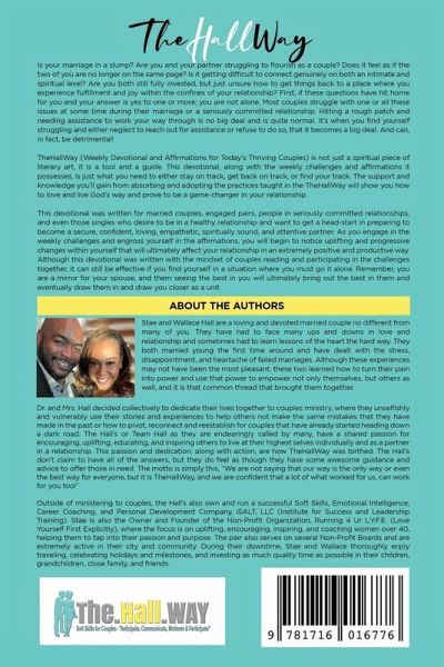 Is your marriage in a slump? Are you and your partner struggling to flourish as a couple? Does it feel as if the two of you are no longer on the same page? Is it getting difficult to connect genuinely on both an intimate and spiritual level? Are you both still fully invested, but just unsure how to get things back to a place where you experience fulfillment and joy within the confines of your relationship? First, if these questions have hit home for you and your answer is yes to one or more; you are not alone. Most couples struggle with one or all these issues at some time during their marriage or a seriously committed relationship. Hitting a rough patch and needing assistance to work your way through is no big deal and is quite normal. It's when you find yourself struggling and either neglect to reach out for assistance or refuse to do so, that it becomes a big deal. And can, in fact, be detrimental! TheHallWay (Weekly Devotional and Affirmations for Today's Thriving Couples) is not just a spiritual piece of literary art, it is a tool and a guide. This devotional, along with the weekly challenges and affirmations it possesses, is just what you need to either stay on track, get back on track, or find your track. The support and knowledge you'll gain from absorbing and adopting the practices taught in the TheHallWay will show you how to love and live God's way and prove to be a game-changer in your relationship. This devotional was written for married couples, engaged pairs, people in seriously committed relationships, and even those singles who desire to be in a healthy relationship and want to get a head-start in preparing to become a secure, confident, loving, empathetic, spiritually sound, and attentive partner. As you engage in the weekly challenges and engross yourself in the affirmations, you will begin to notice uplifting and progressive changes within yourself that will ultimately affect your relationship in an extremely positive and productive way. Although this devotional was written with the mindset of couples reading and participating in the challenges together, it can still be effective if you find yourself in a situation where you must go it alone. Remember, you are a mirror for your spouse, and them seeing the best in you will ultimately bring out the best in them and eventually draw them in and draw you closer as a unit.