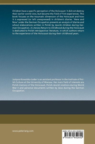 Children have a specific perception of the Holocaust: it did not destroy their earlier world view, but became the field of first experiences. This book focuses on the traumatic dimension of the Holocaust and how it is expressed (or left unexpressed) in children's diaries. «Here and Now» under the German Occupation presents an analysis of diaries and school elaborations written in Polish by Jewish children during German Occupation. A Literary Return to Childhood during the Holocaust is dedicated to Polish retrospective literature, in which authors return to the experience of the Holocaust during their childhood years.