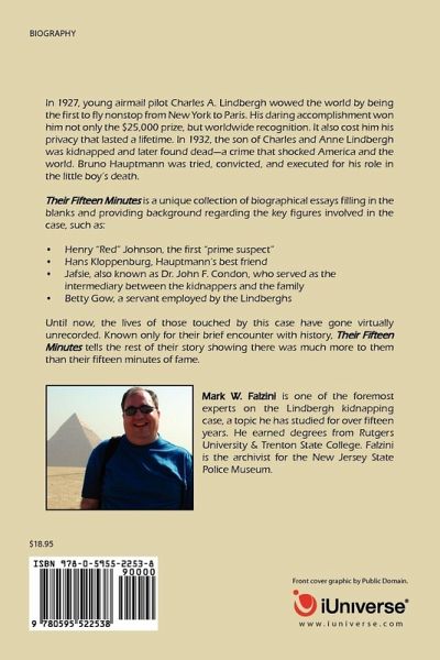 In 1927, young airmail pilot Charles A. Lindbergh wowed the world by being the first to fly nonstop from New York to Paris. His daring accomplishment won him not only the $25,000 prize, but worldwide recognition. It also cost him his privacy that lasted a lifetime. In 1932, the son of Charles and Anne Lindbergh was kidnapped and later found dead-a crime that shocked America and the world. Bruno Hauptmann was tried, convicted, and executed for his role in the little boy's death. Their Fifteen Minutes is a unique collection of biographical essays filling in the blanks and providing background regarding the key figures involved in the case, such as: -Henry "Red" Johnson, the first "prime suspect" -Hans Kloppenburg, Hauptmann's best friend -Jafsie, also known as Dr. John F. Condon, who served as the intermediary between the kidnappers and the family -Betty Gow, a servant employed by the Lindberghs Until now, the lives of those touched by this case have gone virtually unrecorded. Known only for their brief encounter with history, Their Fifteen Minutes tells the rest of their story showing there was much more to them than their fifteen minutes of fame.