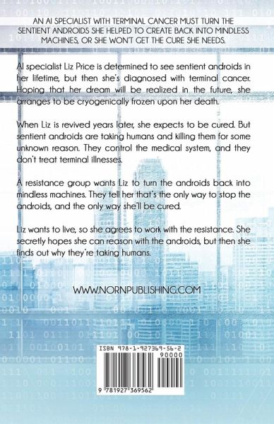 AI specialist Liz Price is determined to see sentient androids in her lifetime, but then she’s diagnosed with terminal cancer. Hoping that her dream will be realized in the future, she arranges to be cryogenically frozen upon her death. When Liz is revived years later, she expects to be cured. But sentient androids are taking humans and killing them for some unknown reason. They control the medical system, and they don’t treat serious illnesses. A resistance group wants Liz to turn the androids back into mindless machines. They tell her that’s the only way to stop the androids, and the only way she’ll be cured. Liz wants to live, so she agrees to work with the resistance. She secretly hopes she can reason with the androids, but then she finds out why they’re taking humans.
