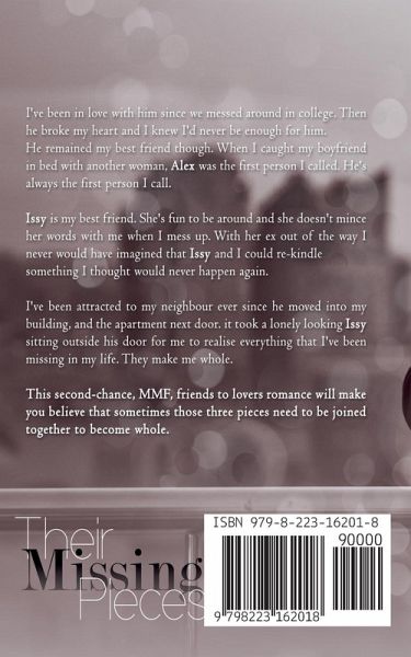 I've been in love with him since we messed around in college. Then he broke my heart and I knew I'd never be enough for him. He remained my best friend though. When I caught my boyfriend in bed with another woman, Alex was the first person I called. He's always the first person I call. Issy is my best friend. She's fun to be around and she doesn't mince her words with me when I mess up. With her ex out of the way I never would have imagined that Issy and I could re-kindle something I thought would never happen again. I've been attracted to my neighbour ever since he moved into my building, and the apartment next door. it took a lonely looking Issy sitting outside his door for me to realise everything that I've been missing in my life. They make me whole. This second-chance, MMF, friends to lovers romance will make you believe that sometimes those three pieces need to be joined together to become whole.