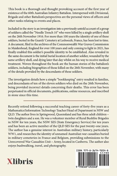 This book is a thorough and thought provoking account of the first year of existence of the 60th Australian Infantry Battalion. Interspersed with Divisional, Brigade and other Battalion's perspectives are the personal views of officers and other ranks relating to events and places. Included in the story is an investigation into a previously untold account of a group of soldiers called the "Needle Trench 10" who were killed by a single artillery shell on the 26th November 1916. For more than 100 years the identity of one of these soldiers, buried in the Guards' Cemetery at Lesboeufs, France, has been lost to time. A document, filed in the archives of the Commonwealth War Graves Commission in Maidenhead, England, for over 100 years and only coming to light in 2021, has finally enabled this soldier's possible identity to be established. Also revealed in the same document is the initial burial location of another soldier, wounded by the same artillery shell, and dying later that day whilst on his way to receive medical treatment. Woven throughout the book are the human stories of the battalion's soldiers, including biographies of those killed on the 26th November, with many of the details provided by the descendants of these soldiers. The investigation details how a simple "bookkeeping" entry resulted in families, and descendants of ten of the eleven soldiers who died on the 26th November, being provided incorrect details concerning their deaths. This error has been perpetuated in official documents, publications, online resources, and inscribed in stone since this time.