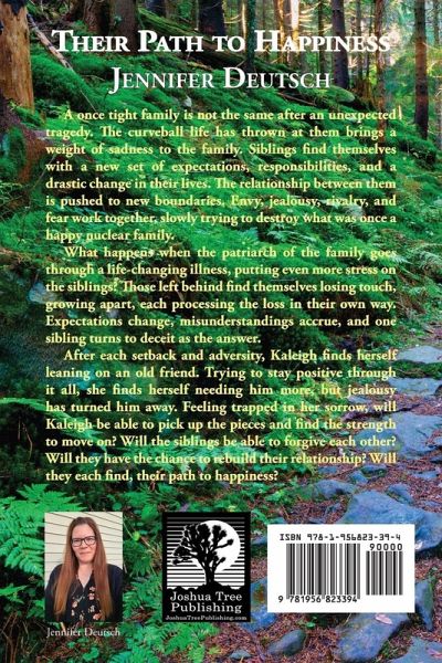 A once tight family is not the same after an unexpected tragedy. The curveball life has thrown at them brings a weight of sadness to the family. Siblings find themselves with a new set of expectations, responsibilities, and a drastic change in their lives. The relationship between them is pushed to new boundaries. Envy, jealousy, rivalry, and fear work together, slowly trying to destroy what was once a happy nuclear family. What happens when the patriarch of the family goes through a life-changing illness, putting even more stress on the siblings? Those left behind find themselves losing touch, growing apart, each processing the loss in their own way. Expectations change, misunderstandings accrue, and one sibling turns to deceit as the answer. After each setback and adversity, Kaleigh finds herself leaning on an old friend. Trying to stay positive through it all, she finds herself needing him more, but jealousy has turned him away. Feeling trapped in her sorrow, will Kaleigh be able to pick up the pieces and find the strength to move on? Will the siblings be able to forgive each other? Will they have the chance to rebuild their relationship? Will they each find, their path to happiness? Author Jennifer Deutsch I am a Reading Intervention Teacher who lives in upstate New York. I have a hard-working husband who supports all of my endeavors, and two beautiful children who are growing bigger by the day. I work to balance this thing we call life, and it is not always easy. I am constantly looking for easier ways to do things, ways to save time, and stay organized. I work with inner-city students who have so much resting on their shoulders, but who deserve the same chance at becoming great readers and having amazing teachers as any other child in America. I work to show my students how many doors will open for them when they learn how to be great readers. I try to teach my students and my own children that good things come with time, dedication, and hard work. My family stretches far and wide across the country, and whenever I have the chance to see them, it helps me to remember how precious our family, our life, and our story is. I consider myself a champion of kindness, and I work everyday to show my kids how to make this world a better place. Life is difficult. I have had my share of curveballs thrown my way. There are things that happen in our lives that try to take away the joy that can be found all around us. Even with all of the trials and roadblocks, I continue to believe in the power of positivity. My own path has been rocky. For so many years I was stuck. I couldn't see where my path might be heading. We may not know for many years why certain things happen and where our path is headed. Our life may seem to be stuck in darkness for so long, but when we come to an overlook, and can see behind us, the purpose of events that happened, the reason certain people entered our lives, that is such a sweet moment. That is a theme in this story, a theme I hope that you can relate to. My wish is that all of you find your . . . Path to Happiness.