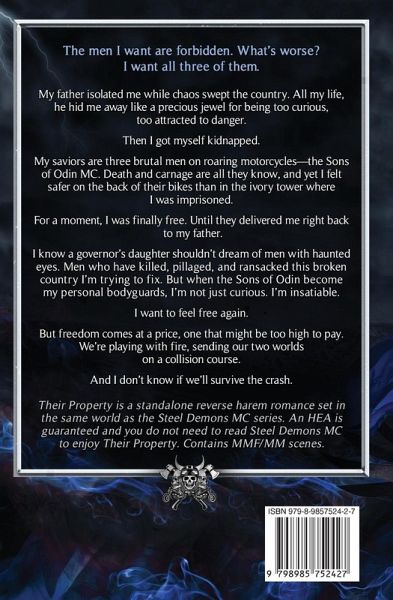 The men I want are forbidden. What's worse? I want all three of them. My father isolated me while chaos swept the country. All my life, he hid me away like a precious jewel for being too curious, too attracted to danger. Then I got myself kidnapped. My saviors are three brutal men on roaring motorcycles--the Sons of Odin MC. Death and carnage are all they know, and yet I felt safer on the back of their bikes than in the ivory tower where I was imprisoned. For a moment, I was finally free. Until they delivered me right back to my father. I know a governor's daughter shouldn't dream of men with haunted eyes. Men who have killed, pillaged, and ransacked this broken country I'm trying to fix. But when the Sons of Odin become my personal bodyguards, I'm not just curious. I'm insatiable. I want to feel free again. But freedom comes at a price, one that might be too high to pay. We're playing with fire, sending our two worlds on a collision course. And I don't know if we'll survive the crash. Their Property is a standalone reverse harem romance set in the same world as the Steel Demons MC series. An HEA is guaranteed and you do not need to read Steel Demons MC to enjoy Their Property. Contains MMF/MM scenes.