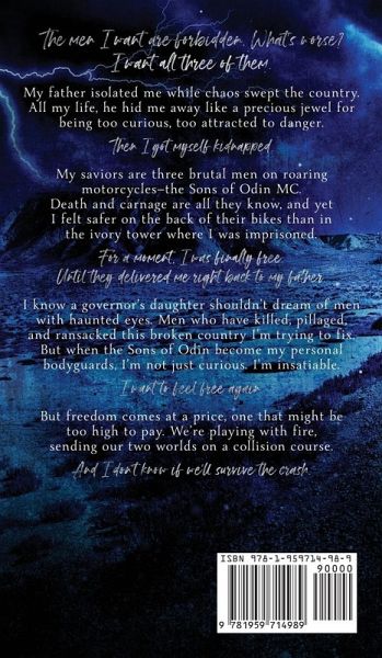 The men I want are forbidden. What's worse? I want all three of them. My father isolated me while chaos swept the country. All my life, he hid me away like a precious jewel for being too curious, too attracted to danger. Then I got myself kidnapped. My saviors are three brutal men on roaring motorcycles--the Sons of Odin MC. Death and carnage are all they know, and yet I felt safer on the back of their bikes than in the ivory tower where I was imprisoned. For a moment, I was finally free. Until they delivered me right back to my father. I know a governor's daughter shouldn't dream of men with…mehr