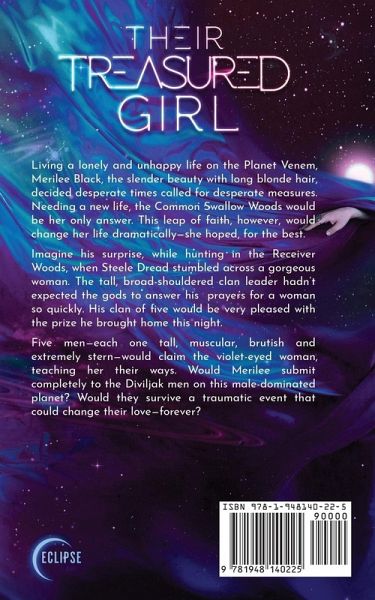Living a lonely and unhappy life on the Planet Venem, Merilee Black, a slender beauty with long blonde hair, decided desperate times called for desperate measures. She needed a new life and the Common Swallow Woods would be her only answer. This leap of faith, however, would change her life dramatically - she hoped, for the best. Imagine his surprise, while hunting in the Receiver Woods, when Steele Dread stumbled across a gorgeous woman. The tall, broad-shouldered clan leader hadn't expected the gods to answer his prayers for a woman so quickly. His clan of five would be very pleased with the prize he brought home this night. Five men - each one tall, muscular, brutish and extremely stern - would claim the violet-eyed woman, teaching her their ways. Would Merilee submit completely to the Diviljak men on this male-dominated planet? Would they survive a traumatic event that could change their love forever?