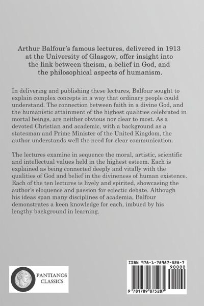 Arthur Balfour's famous lectures, delivered in 1913 at the University of Glasgow, offer insight into the link between theism, a belief in God, and the philosophical aspects of humanism. In delivering and publishing these lectures, Balfour sought to explain complex concepts in a way that ordinary people could understand. The connection between faith in a divine God, and the humanistic attainment of the highest qualities celebrated in mortal beings, are neither obvious nor clear to most. As a devoted Christian and academic, with a background as a statesman and Prime Minister of the United Kingdom, the author understands well the need for clear communication. The lectures examine in sequence the moral, artistic, scientific and intellectual values held in the highest esteem. Each is explained as being connected deeply and vitally with the qualities of God and belief in the divineness of human existence. Each of the ten lectures is lively and spirited, showcasing the author's eloquence and passion for eclectic debate. Although his ideas span many disciplines of academia, Balfour demonstrates a keen knowledge for each, imbued by his lengthy background in learning.