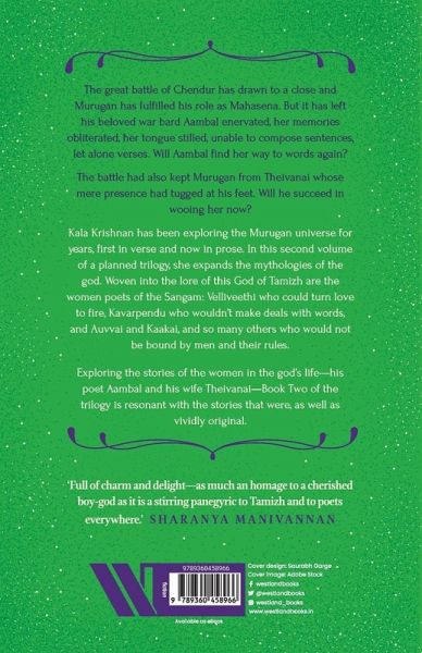 About the Book KALA KRISHNAN'S MURUGAN TRILOGY DELVES RIGHT INTO THE HEART OF WHAT IT IS ABOUT THIS GOD THAT'S SO COMPELLING, WHY HE ELICITS NOT JUST DEVOTION BUT ALSO LOVE. The great battle of Chendur has drawn to a close and Murugan has fulfilled his role as Mahasena. But it has left his beloved war bard Aambal enervated, her memories obliterated, her tongue stilled, unable to compose sentences, let alone verses. Will Aambal find her way to words again? The battle had also kept Murugan from Theivanai whose mere presence had tugged at his feet. Will he succeed in wooing her now? Kala Krishnan has been exploring the Murugan universe for years now, first in verse and now in prose. In this second volume of a planned trilogy, she expands the mythologies of the god. Kumara, Karthikeya, Kandhan, Velan, Mahasena: the god of Tamizh, the patron of the Great Assembly of poets in Madurai, friend and mentor to the hot-headed and fiercely loyal Aambal, known to all as 'Murugan's poet'. Exploring the stories of the women in the god's life-his poet Aambal and his wife Theivanai-Book Two of the trilogy is resonant with the stories that were, as well as vividly original. About the Author Kala Krishnan is the author of two books of poetry, He Is Honey, Salt and the Most Perfect Grammar (2016) and Offer Him All Things, Charred, Burned & Cindered (2018) and of Mahasena, Part One of the Murugan Trilogy. She lives in Bangalore with Paru, Gauri, Sathyavak and Totoro.