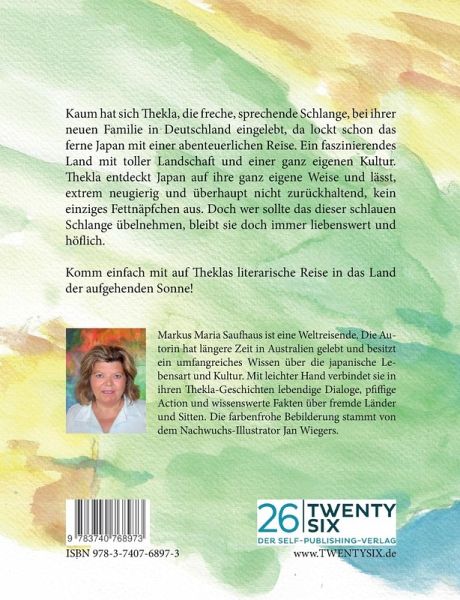 Kaum hat sich Thekla, die freche, sprechende Schlange, bei ihrer neuen Familie in Deutschland eingelebt, da lockt schon das ferne Japan mit einer abenteuerlichen Reise. Ein faszinierendes Land mit toller Landschaft und einer ganz eigenen Kultur. Thekla entdeckt Japan auf ihre ganz eigene Weise und lässt, extrem neugierig und überhaupt nicht zurückhaltend, kein einziges Fettnäpfchen aus. Doch wer sollte das dieser schlauen Schlange übelnehmen, bleibt sie doch immer liebenswert und höflich. Komm einfach mit auf Theklas literarische Reise in das Land der aufgehenden Sonne!