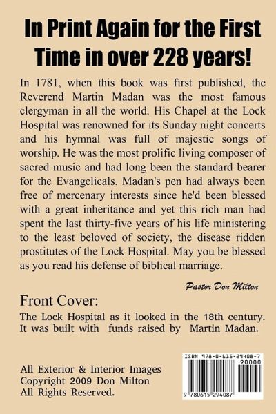 This is the first republication of Volume 3 of a rare three volume set of books favoring polygamy. In 1781, when this book was first published, the Reverend Martin Madan was the most famous clergyman in all the world. His Chapel at the Lock Hospital was renowned for its Sunday night concerts and his hymnal was full of majestic songs of worship. He was the most prolific living composer of sacred music and had long been the standard bearer for the Evangelicals. Madan's pen had always been free of mercenary interests since he'd been blessed with a great inheritance and yet this rich man had spent the last thirty-five years of his life ministering to the least beloved of society, the disease ridden prostitutes of the Lock Hospital. The front cover features a portrait of Lock Hospital as it appeared in the 18th century. It was built with funds raised by Martin Madan. Madan was godfather to the famed hymn writer, Charles Wesley and was himself the most prolific hymn composer of his day. This is Volume 3 - In Print Again for the First Time in over 228 years.