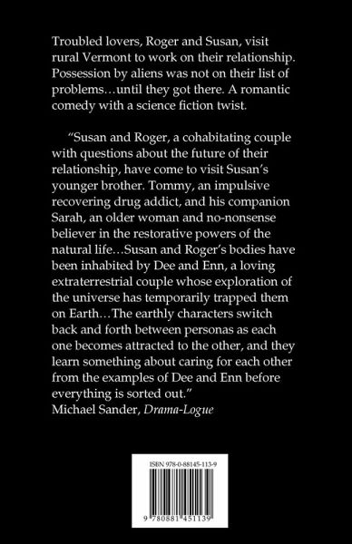 Troubled lovers, Roger and Susan, visit rural Vermont to work on their relationship. Possession by aliens was not on their list of problems ... until they got there. A romantic comedy with a science fiction twist. "Susan and Roger, a cohabitating couple with questions about the future of their relationship, have come to visit Susan's younger brother. Tommy, an impulsive recovering drug addict, and his companion Sarah, an older woman and no-nonsense believer in the restorative powers of the natural life ... Susan and Roger's bodies have been inhabited by Dee and Enn, a loving extraterrestrial couple whose exploration of the universe has temporarily trapped them on Earth ... The earthly characters switch back and forth between personas as each one becomes attracted to the other, and they learn something about caring for each other from the examples of Dee and Enn before everything is sorted out." -Michael Sander, Drama-Logue