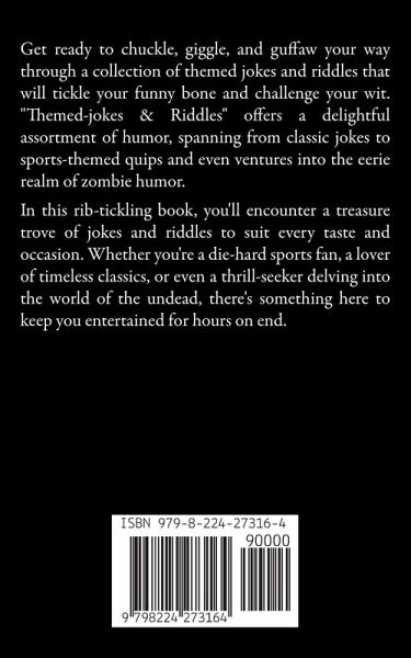 Get ready to chuckle, giggle, and guffaw your way through a collection of themed jokes and riddles that will tickle your funny bone and challenge your wit. "Themed-jokes & Riddles" offers a delightful assortment of humor, spanning from classic jokes to sports-themed quips and even ventures into the eerie realm of zombie humor. In this rib-tickling book, you'll encounter a treasure trove of jokes and riddles to suit every taste and occasion. Whether you're a die-hard sports fan, a lover of timeless classics, or even a thrill-seeker delving into the world of the undead, there's something here to keep you entertained for hours on end.