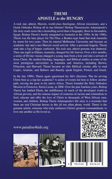 A rock star, atheist, Marxist, world-class theologian, African missionary, and a Greek Orthodox Bishop all in one lifetime? Bishop Themistocles Adamopoulo's life story reads more like a bestselling novel than a biography. Born in Alexandria, Egypt, Bishop Themi's family emigrated to Australia in the 1950s. In the 1960s, Themi was the bass player for The Flies, a Beatles-type band that took Australia by storm for two years. Then he entered Melbourne University and became an academic star and a neo-Marxist social activist. After a personal tragedy, Themi sank into a fog of hippie confusion. His rock star, atheist persona was shattered. Then one night in Eltham, Australia, changed his life forever. Over a few months, a series of Divine visions changed a young man from a lost soul into a servant of Jesus Christ. He studied theology, languages, and Biblical studies at some of the most prestigious universities in Australia and America, including Brown, Princeton, and Harvard. Themi became an elite Biblical scholar, able to read Coptic, Aramaic, and Hebrew and fluently speak English, French, and Greek. In the late 1990s, Themi again questioned his life's direction. Was he serving Christ best as a top-tier academic? A series of events led him to follow another path, serving the poor in his native Africa. Themi founded the Holy Orthodox Mission in Freetown, Sierra Leone, in 2008. Over the past fourteen years, Bishop Themi has battled Ebola, the indifference of much of the developed world to African poverty, and the ruinous impact of centuries of racism and colonialism to feed, educate and offer the love of Christ to thousands of West African men, women, and children. Bishop Themi Adamopoulo's life story is a reminder that there are real Christian heroes in this all too often phony world. Themi is the genuine article, someone who truly embraces Christ's greatest commandment, to love one another as He loved us.