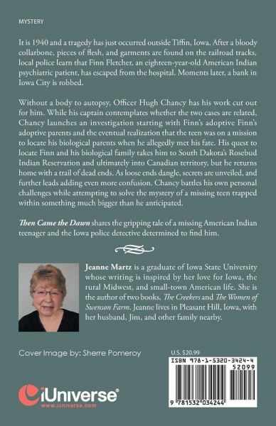 It is 1940 and a tragedy has just occurred outside Tiffin, Iowa. After a bloody collarbone, pieces of flesh, and garments are found on the railroad tracks, local police learn that Finn Fletcher, an eighteen-year-old American Indian psychiatric patient, has escaped from the hospital. Moments later, a bank in Iowa City is robbed. Without a body to autopsy, Officer Hugh Chancy has his work cut out for him. While his captain contemplates whether the two cases are related, Chancy launches an investigation starting with Finn's adoptive Finn's adoptive parents and the eventual realization that the teen was on a mission to locate his biological parents when he allegedly met his fate. His quest to locate Finn and his biological family takes him to South Dakota's Rosebud Indian Reservation and ultimately into Canadian territory, but he returns home with a trail of dead ends. As loose ends dangle, secrets are unveiled, and further leads adding even more confusion. Chancy battles his own personal challenges while attempting to solve the mystery of a missing teen trapped within something much bigger than he anticipated. Then Came the Dawn shares the gripping tale of a missing American Indian teenager and the Iowa police detective determined to find him.