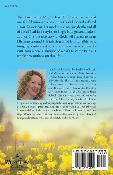 Then God Said to Me, "I Have Him" is the true story of one fateful summer, when the author’s husband suffered a horrific accident, her mother was nearing death, and all of the difficulties in trying to juggle both grave situations at once. It is the true story of God’s willingness to wrap His arms around His grieving child in a tangible way, bringing comfort and hope. It is an account of a heavenly visitation where a glimpse of what’s to come brings a whole new outlook on this life.