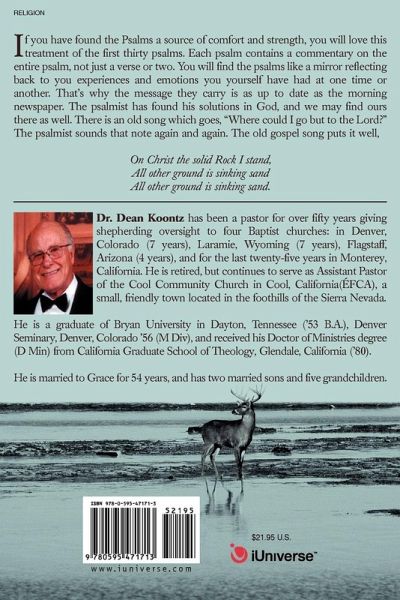 If you have found the Psalms a source of comfort and strength, you will love this treatment of the first thirty psalms. Each psalm contains a commentary on the entire psalm, not just a verse or two. You will find the psalms like a mirror reflecting back to you experiences and emotions you yourself have had at one time or another. That's why the message they carry is as up to date as the morning newspaper. The psalmist has found his solutions in God, and we may find ours there as well. There is an old song which goes, "Where could I go but to the Lord?" The psalmist sounds that note again and again. The old gospel song puts it well, On Christ the solid Rock I stand, All other ground is sinking sand All other ground is sinking sand.