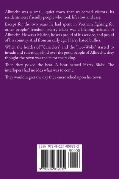 Albrecht was a small, quiet town that welcomed visitors. Its residents were friendly people who took life slow and easy. Except for the two years he had spent in Vietnam fighting for other peoples' freedom, Harry Blake was a lifelong resident of Albrecht. He was a Marine, he was proud of his service, and proud of his country. And from an early age, Harry hated bullies. When the hordes of "Cancelers" and the "neo-Woke" started to invade and run roughshod over the good people of Albrecht, they thought the town was theirs for the taking. Then they poked the bear. A bear named Harry Blake. The interlopers had no idea what was to come. They would regret the day they encroached upon his town.