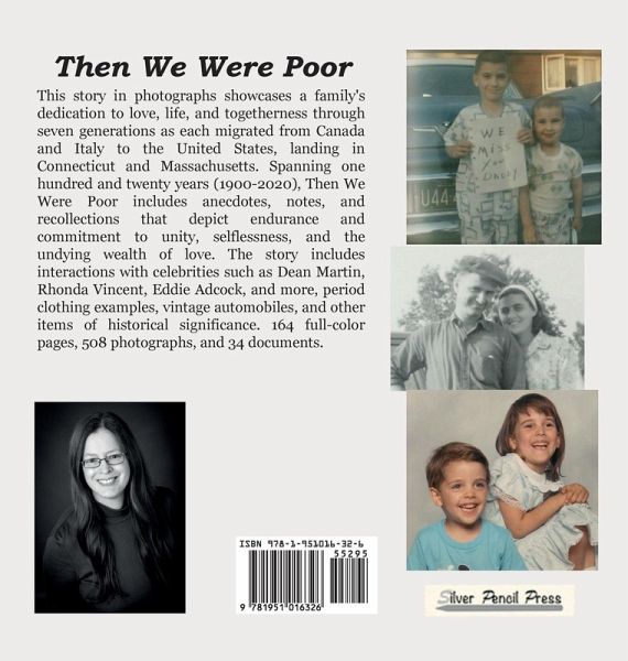 Then We Were Poor showcases a family's dedication to love, life, and togetherness through seven generations as each migrated from Canada and Italy to the United States, landing in Connecticut and Massachusetts. Spanning one hundred and twenty years (1900-2020), Then We Were Poor includes anecdotes, notes, and recollections that depict endurance and commitment to unity, selflessness, and the undying wealth of love. The photographic story includes interactions with celebrities such as Dean Martin, Rhonda Vincent, Eddie Adcock, and more, period clothing examples, vintage automobiles, and other items of historical significance. 164 full-color pages, 508 photographs, and 34 documents.