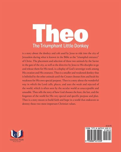 Theo: The Triumphant Little Donkey is a story about the donkey and colt used by Jesus to ride into the city of Jerusalem during what is known in the Bible as the "triumphal entrance" of Christ. The placement and selection of these two animals by the Savior in the gate of the city, as well as the directive by Jesus to His disciples to go and release them for His need, is a display of God's sovereign work among His creation and His creatures. Theo is a smaller and weakened donkey that is belittled by the other animals until the Creator chooses him and heals his weakness for His own special purpose. Theo is a story about the wonderful way in which the Lord calls, places, and uses the weak and rejected of the world, which is often seen by the secular world as unacceptable and unusable. Theo tells the story of how God chooses the least, the last, and the forgotten of the world for His very special and specific purpose and plan. Theo is a story meant to build faith and hope in a world that endeavors to destroy those two most important Christian values.