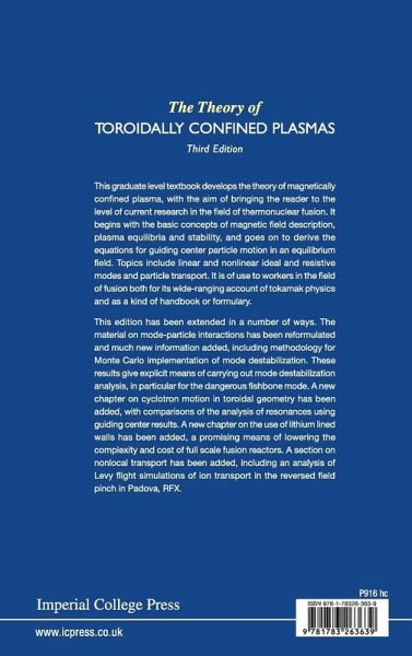 This graduate level textbook develops the theory of magnetically confined plasma, with the aim of bringing the reader to the level of current research in the field of thermonuclear fusion. It begins with the basic concepts of magnetic field description, plasma equilibria and stability, and goes on to derive the equations for guiding center particle motion in an equilibrium field. Topics include linear and nonlinear ideal and resistive modes and particle transport. It is of use to workers in the field of fusion both for its wide-ranging account of tokamak physics and as a kind of handbook or formulary. This edition has been extended in a number of ways. The material on mode-particle interactions has been reformulated and much new information added, including methodology for Monte Carlo implementation of mode destabilization. These results give explicit means of carrying out mode destabilization analysis, in particular for the dangerous fishbone mode. A new chapter on cyclotron motion in toroidal geometry has been added, with comparisons of the analysis of resonances using guiding center results. A new chapter on the use of lithium lined walls has been added, a promising means of lowering the complexity and cost of full scale fusion reactors. A section on nonlocal transport has been added, including an analysis of Levy flight simulations of ion transport in the reversed field pinch in Padova, RFX.