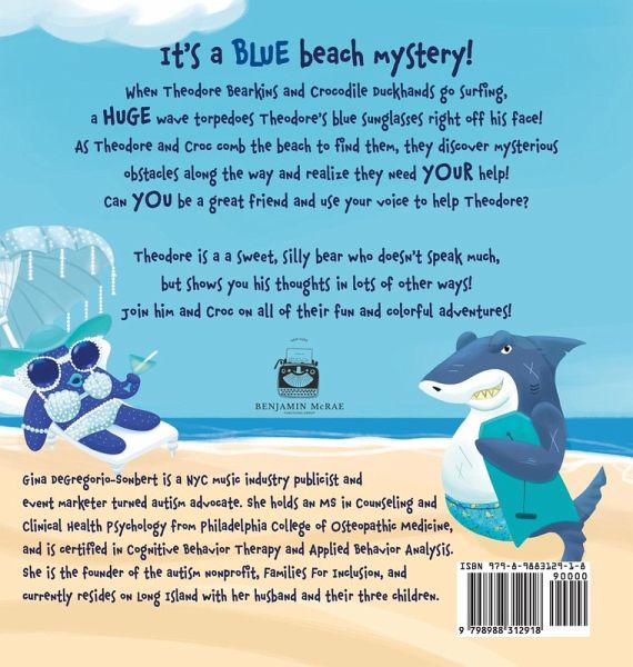 It is a BLUE beach mystery! When Theodore and his best friend Crocodile Duckhands go surfing, a HUGE wave torpedoes Theodore's blue sunglasses off his face! As the pair comb the beach to find them, they discover mysterious obstacles along the way and realize they need YOU to be a great friend and use your voice to help them. Reminiscent of fan favorites The Monster At The End of This Book, and The Book With No Pictures, Theodore Bearkins brings the reader physically into the story, asking them to dig into the sand and to yell silly things out loud in order to help the characters find Theodore's sunglasses. It is the first installment in a full collection of Theodore Bearkins' fun and colorful adventures. ABOUT THE BEAR: Theodore is the FIRST-EVER autistic, non-speaking main character in a children's picture book series where autism is NOT the focus of his tale. He is a sweet, silly bear who doesn't speak much, but expresses his thoughts in lots of other ways. ALL kids find Theodore fun and engaging, whether they realize he has autism or not. Rather than depicting autism as a "superpower," Theodore normalizes ASD for children. He is a whole bear, with lots of different interests and adventures. Neurodivergent and neurotypical kids alike relate to his stories, feelings, and experiences, setting the example that we are all different, yet all the same. ABOUT THE SERIES: In reality, most people will only choose a book about autism if there is already someone with ASD in their life. These books are geared toward all children, particularly those who do not know someone with ASD, as a way to naturally introduce children to autism and inclusion in a subtle and non-obvious way, maybe even without them realizing it! This allows them to experience a fun, silly story that they will remember, with values that they will organically absorb. Rather than promote inclusion head-on in an obvious fashion, these books create a natural discussion about differences and inclusivity, but it's not necessary to bring those topics to the reader's attention unless the adult chooses to do so. If not, the child will internalize the message just by reading the pages. Theodore Bearkins is the perfect series for teaching inclusion and friendship in the classroom. The end of each book features a story discussion guide which includes tips on talking to early elementary children about autism, differences, and inclusion, if parents or teachers would like to utilize it. Included in the discussion guide are the different autistic traits Theodore might exhibit throughout the book. Unless the reader knows he's autistic, they will not realize the traits are common to people with autism, because they are things that anyone might do, making Theodore and his autistic traits relatable to all kids. In addition, each book in the series has a different color scheme and theme, creating a beautiful set of books that kids love to collect! ABOUT THE AUTHOR: A mom to three young children, Gina's middle child, seven-year-old Teddy, is autistic and minimally-speaking. She created this book series as a means to educate Teddy's peers and classmates about autism and now wants all kids to enjoy and learn from Theodore. She is a NYC music industry publicist and event marketer, who's worked with everyone from Carly Simon to Coldplay, turned autism advocate. She holds an MS in Counseling and Clinical Health Psychology from Philadelphia College of Osteopathic Medicine, and is certified in Cognitive Behavior Therapy and Applied Behavior Analysis. She is the founder of the autism nonprofit, Families For Inclusion, of which a portion of the proceeds of book sales will be donated, and she currently resides on Long Island with her husband and their three children.