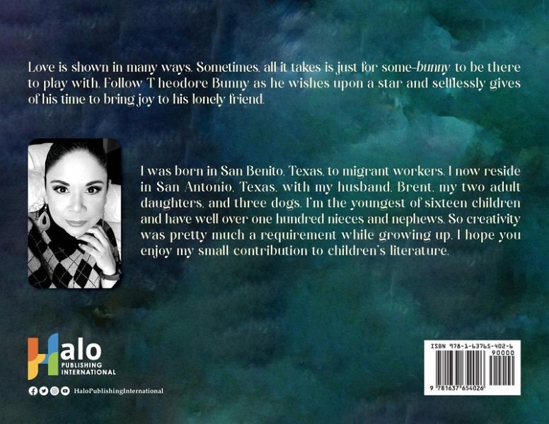 I was born in San Benito, Texas, to migrant workers. I now reside in San Antonio, Texas, with my husband, Brent, my two adult daughters, and three dogs. I'm the youngest of sixteen children and have well over one hundred nieces and nephews. So creativity was pretty much a requirement while growing up. I hope you enjoy my small contribution to children's literature.