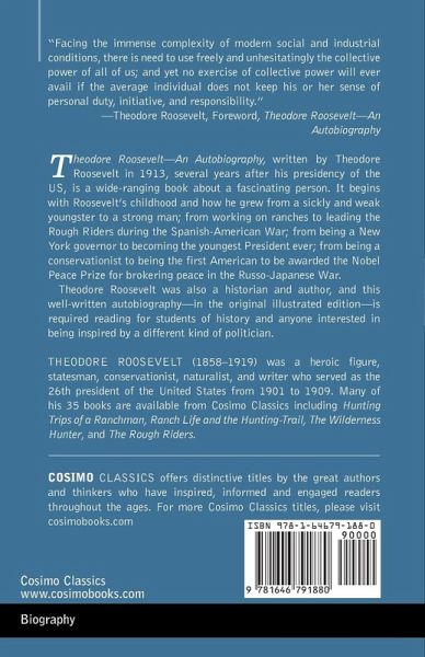 "Facing the immense complexity of modern social and industrial conditions, there is need to use freely and unhesitatingly the collective power of all of us; and yet no exercise of collective power will ever avail if the average individual does not keep his or her sense of personal duty, initiative, and responsibility." —Theodore Roosevelt, Foreword Theodore Roosevelt—An Autobiography Theodore Roosevelt—An Autobiography written by Theodore Roosevelt in 1913, several years after his presidency of the US, is a wide-ranging book about a fascinating person. It begins with Roosevelt’s childhood and how he grew from a sickly and weak youngster to a strong man; from working on ranches to leading the Rough Riders during the Spanish-American War; from being a New York governor to becoming the youngest President ever; from being a conservationist to being the first American to be awarded the Nobel Peace Prize for brokering peace in the Russo-Japanese War. Theodore Roosevelt was also a historian and author, and this well-written autobiography—in the original illustrated edition—is required reading for students of history and anyone interested in being inspired by a different kind of politician.