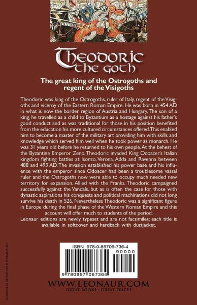 The great king of the Ostrogoths and regent of the Visigoths Theodoric was king of the Ostrogoths, ruler of Italy, regent of the Visigoths and viceroy of the Eastern Roman Empire. He was born in 454 AD in what is now the border region of Austria and Hungary. The son of a king, he travelled as a child to Byzantium as a hostage against his father's good conduct and as was traditional for those in his position benefited from the education his more cultured circumstances offered. This enabled him to become a master of the military art providing him with skills and knowledge which served him well when he took power as monarch. He was 31 years old before he returned to his own people. At the behest of the Byzantine Emperor Zeno. Theodoric invaded King Odoacer's Italian kingdom fighting battles at Isonzo, Verona, Adda and Ravenna between 488 and 493 AD. The invasion established his power base and his influence with the emperor since Odoacer had been a troublesome vassal ruler and the Ostrogoths now were able to occupy much needed new territory for expansion. Allied with the Franks, Theodoric campaigned successfully against the Vandals, but as is often the case for those with dynastic aspirations his conquests and political machinations did not long survive his death in 526. Nevertheless Theodoric was a significant figure in Europe during the final phase of the Western Roman Empire and this account will offer much to students of the period. Leonaur editions are newly typeset and are not facsimiles; each title is available in softcover and hardback with dustjacket.