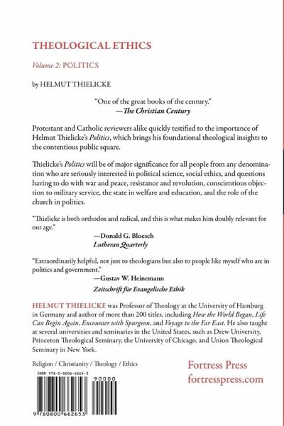 Protestant and Catholic reviewers alike quickly testified to the importance of Helmut Thielicke's Politics, which brings his foundational theological insights to the contentious public square. Thielicke's Politics will be of major significance for all people from any denomination who are seriously interested in political science, social ethics, and questions having to do with war and peace, resistance and revolution, conscientious objection to military service, the state in welfare and education, and the role of the church in politics.