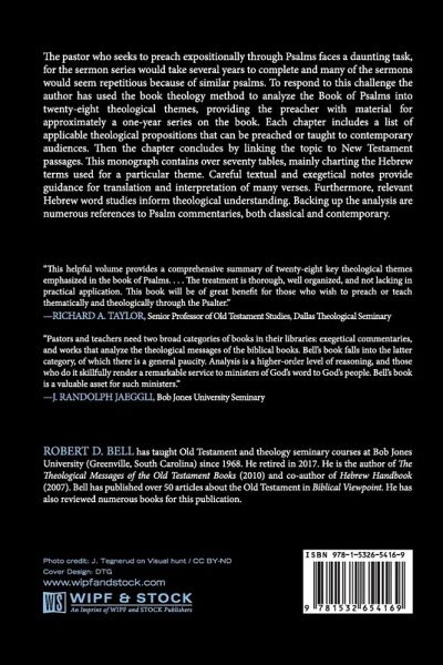 The pastor who seeks to preach expositionally through Psalms faces a daunting task, for the sermon series would take several years to complete and many of the sermons would seem repetitious because of similar psalms. To respond to this challenge the author has used the book theology method to analyze the Book of Psalms into twenty-eight theological themes, providing the preacher with material for approximately a one-year series on the book. Each chapter includes a list of applicable theological propositions that can be preached or taught to contemporary audiences. Then the chapter concludes by linking the topic to New Testament passages. This monograph contains over seventy tables, mainly charting the Hebrew terms used for a particular theme. Careful textual and exegetical notes provide guidance for translation and interpretation of many verses. Furthermore, relevant Hebrew word studies inform theological understanding. Backing up the analysis are numerous references to Psalm commentaries, both classical and contemporary.
