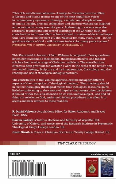 Acknowledgements List of Abbreviations Contributions 1. Theological Theology Darren Sarisky 2. John Ivor J. Davidson University of Aberdeen UK 3. The Word Answering the Word: Opening the Space of Catholic Biblical Interpretation Lewis O. Ayres Durham University UK 4. Divine Sufficiency: Theology in the Presence of God Ivor J. Davidson University of Aberdeen UK 5. The Last Judgement David Fergusson The University of Edinburgh UK 6. Proportion and Topography in Ecclesiology: A Working Paper on the Dogmatic Location of the Doctrine of the Church Tom Greggs University of Aberdeen UK 7. How to be Caught by the Holy Spirit Stanley Hauerwas Duke Divinity School USA 8. Some Riffs on Thomas Aquinas' De Ente et Essentia Robert Jenson St Olaf College USA 9. New - Old - New: Theological Aphorisms Eberhard Jüngel Eberhard Karls Universitaet Tuebingen Germany 10. God's Hiddennness and Belief in His Power Wolf Krötke Humboldt Universitaet zu Berlin Germany 11. What is the Gospel? Matthew Levering Mundelein Seminary USA 12. Barth Critique of Schleiermacher Reconsidered Bruce McCormack Princeton Theological Seminary USA 13. Aristotle's Saviour Francesca A. Murphy University of Notre Dame USA 14. Webster and Ebeling on Christian Texts: A Placeholder for a Theological Theology of Language R. David Nelson USA 15. What is Truth? McLeod Campbell Revisited George Newlands University of Glasgow UK 16. The Divine Perfections and the Economy: The Atonement Kenneth Oakes University of Notre Dame USA 17. A Prolegomenon to an Account of Theological Interpretation of Scripture Darren Sarisky University of Oxford UK 18. The Sinlessness of Christ Katherine Sonderegger Virginia Theological Seminary USA 19/ Unconditional Love: Creation ex Nihilo and the Covenant of Grace Justin Stratis Trinity College Bristol UK 20. "Exegesis I know and Theology I know But Who Are You?" Acts 19 and the Theological Interpretation of Scripture Kevin J. Vanhoozer Trinity Evangelical Divinity School USA 21. Does Historical Criticism Exist? A Contribution to Debate on the Theological Interpretation of Scripture Francis Watson Durham University UK 22. The Transcendence of Apophaticism A. N. Williams Independent Scholar 23. The Fourfold Chord: Theology and the Plurality of the Gospel Witness Rowan Williams Cambridge University UK Index