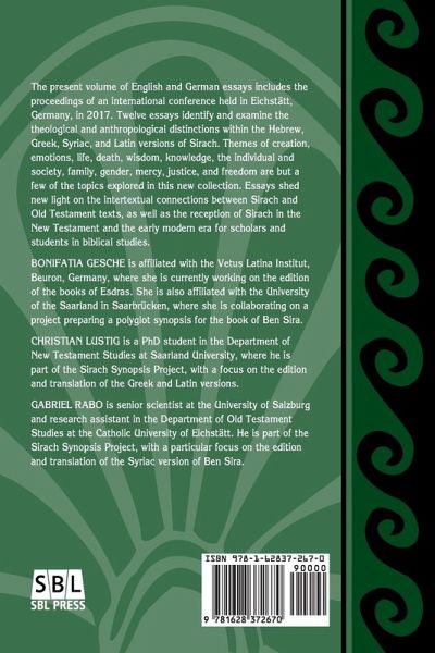 Twelve essays in English and German shed light on the theology and anthropology of Sirach. The present volume includes the proceedings of an international conference held in Eichstaett, Germany, in 2017.