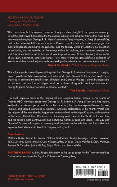 Theology and Game of Thrones explores themes of religion, institutional norms, and power, Christian ecclesiology, Augustinian thought, religious pluralism and representation, and theology's relationship with sexual violence and death in the HBO television series and the original A Song of Ice and Fire novels.