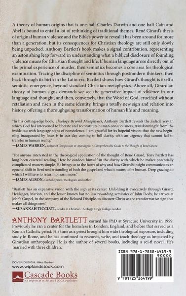 A theory of human origins that is one-half Charles Darwin and one-half Cain and Abel is bound to entail a lot of rethinking of traditional themes. Rene Girard's thesis of original human violence and the Bible's power to reveal it has been around for more than a generation, but its consequences for Christian theology are still only slowly being unpacked. Anthony Bartlett's book makes a signal contribution, representing an astonishing leap forward in understanding what a biblical disclosure of founding violence means for Christian thought and life. If human language arose directly out of the primal experience of murder, then semiotics becomes a core area for theological examination. Tracing the discipline of semiotics through postmodern thinkers, then back through its birth in the Latin era, Bartlett shows how Girard's thought is itself a semiotic emergence, beyond standard Christian metaphysics. Above all, Girardian theory of human signs demands we see the generative impact of violence in our language and thought, and then, conversely, that the Word of God, crucified without retaliation and risen in the same identity, brings a totally new sign and relation into history, offering a thoroughgoing transformation of human life and meaning.