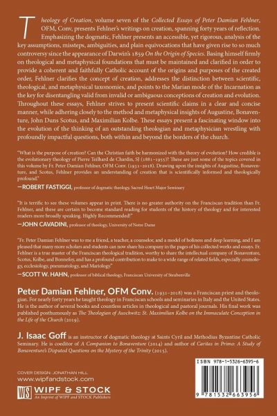Theology of Creation, volume seven of the Collected Essays of Peter Damian Fehlner,presents Fehlner's writings on creation, spanning forty years of reflection. Emphasizing the dogmatic, Fehlner presents an accessible, yet rigorous, analysis of the key assumptions, missteps, ambiguities, and plain equivocations that have given rise to so much controversy since the appearance of Darwin's 1859 On the Origin of Species. Basing himself firmly on theological and metaphysical foundations that must be maintained and clarified in order to provide a coherent and faithfully Catholic account of the origins and purposes of the created order, Fehlner clarifies the concept of creation, addresses the distinction between scientific, theological, and metaphysical taxonomies, and points to the Marian mode of the Incarnation as the key for disentangling valid from invalid or ambiguous conceptions of creation and evolution. Throughout these essays, Fehlner strives to present scientific claims in a clear and concise manner, while adhering closely to the method and metaphysical insights of Augustine, Bonaventure, John Duns Scotus, and Maximilian Kolbe. These essays present a fascinating window into the evolution of the thinking of an outstanding theologian and metaphysician wrestling with profoundly impactful questions, both within and beyond the borders of the church.